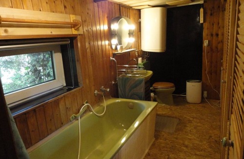 Hidden in the shady grove of our estate is the cosy and rustic former mobile home as a guest house without Wi-Fi and TV. The 30 square metre tiny house has a bathroom, a bedroom with a double bed (140 cm wide), a fitted kitchen and a living room, all simple and minimalist.