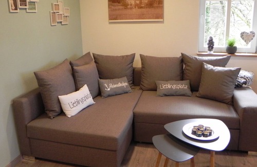The apartment is located in the 2nd Floor of the mill building. Where once the flour was ground, a modern apartment has been created, which invites you to feel good with many cozy details. We as hosts live in the neighboring building and are very happy to help the guests. The apartment is part of the Tiererlebnishof Obermühle: live here ponies, goats, sheep, dogs, cats and many other animals. A beautiful playground and a large meadow invite you to play.
