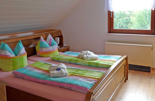 The modernized in 2014, family-friendly apartment (use for fitters is not desired) is located separately on the upper floor of a residential building on the 2700 sqm residential land of the landlord in a quiet location. For guests a 1500 square meter area with sunbathing area, sitting area, pool (D = 3,60 m) and fencing was demarcated. The apartment is equipped with a living room (upholstered furniture with sleeping function, dining table, flat screen TV, stereo, DVD, holiday library), a kitchen (electric stove with oven, fridge with freezer, dishwasher, microwave, div. Kitchen appliances), a bedroom (1 x double bed, 1 x 2 single beds, separated by room dividers) and shower / WC and central heating. W-LAN, a furnished terrace or Outdoor sitting area, barbecue, storage for bicycles and parking. Bicycles can be rented on request for 5 EUR / bike and day. For infants are a crib highchair and toys / equipment ready. The total price includes final cleaning, bed linen, towels, water and energy consumption. Pets: This object allows pets (EUR 5 / day). The pet must be registered with the booking. If an entry note is not possible, a late registration must be made.