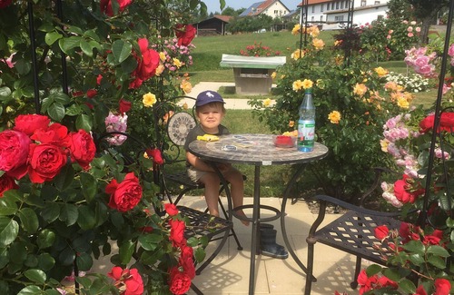The holiday apartment West, 44 sqm, in the village of roses Nöggenschwiel, accommodates up to 2 guests. You have a living room with kitchenette, a bedroom and a bathroom. The fully equipped, private kitchen allows you to prepare your own meals. The property offers step-free access and a barrier-free interior for convenient mobility. Private amenities include Wi-Fi, suitable for video calls, and a TV. From the living room, you can access the spacious terrace without steps, which leads to a lawn area planted with numerous roses.