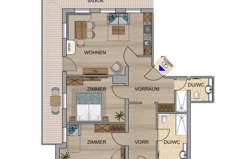 The apartment SONNE is called that way because it is very sunny - very easy. You live at ground level on 100 m² and can look forward to a large family bedroom and a double room. 2 bathrooms with bath and large shower and 2 toilets are self-evident. The cozy living room with seating area and tiled stove, sofa bed for TV and the kitchen with oven, dishwasher and microwave ensure the well-being. Especially the big balconies, sunny and with Kaiserblick!
