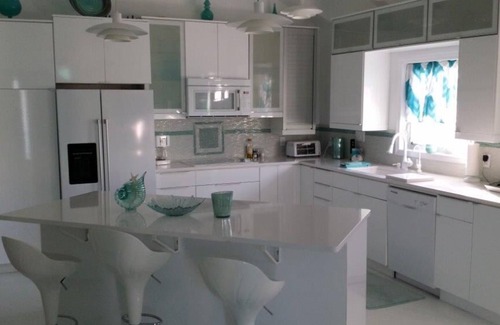 Stunning beauty brings the colors of the aqua colored sea inside the house in a cozy contemporary setting. Professional designed and decorated. 4 bedrooms, 3 1/2 baths spacious home includes guest house and separate laundry room, new private heated salt pool. Separate spa on private patio; 2 king bedrooms with an additional twin bed..Total 4 King beds, 2 twin beds, 1 with two added twin beds in trundle for children, etc. Sleeps 12. Home built with green building materials with amazing insulation! We added large heated spa on back patio with new privacy wall!!! Sports toys: 2 paddle boards, 2 2-seater kayaks and 2 1-seater kayaks with life vests and dolly, boogie boards (adult/children), snorkel equipment and sand buckets/pails, large heated salt pool, cornhole game. There are also folding beach chairs to take the short tiled walkway to the beach. Beach towels and bathrobes provided. Home includes complete laundry room with two washers and two dryers, full size appliances; large flatscreen tv in every major room; with Blue-ray players. Four master bedrooms, one with oversized tub, private showers and separate toilet rooms in each suite. These suites have a separate desk/vanity with another in the great room. Dramatic 25 ft tall detailed ceiling in one master bedroom and the great room. Eat at the dining table or at the huge island bar. Beautiful separate outdoor shower. Fully stocked kitchen with the best of amenities and all appliances ever needed! Enjoy all this on one level and every bedroom has total privacy with each location. Extra seating areas along with the entertainment seating in the great room. You are never crowded in the extra large great room. It's a great place to gather your family/friends groups. If you have seen the sandals commercial, you have seen our beach without all the people. Private gazebo, shared by the 5 completed individual custom homes next to the beach with table/chairs in a covered setting to watch the kids play in the water or enjoy your lunch as you watch the waves. Beautiful views as you lounge on our 30 ft deck at our villa or inside on the sofa's and ottomans. Complete outdoor furniture setting with sofa sectional, tables and chairs/umbrellas to accommodate you and your guests/family right on your own deck! R/O filtration system to provide filtered water at the sink with ultraviolet purification systems for both air and water. Large gas barbeque on the patio for your use. Wifi. Rare Satellite TV provided. Most rentals have only 6 local channels or cable tv which is about 20 channels. You have lots of free movie channels and programs to entertain you along with sports!! Beach towels and all linens provided. We have, at considerable expense, installed full satellite TV, which is rare on the island. You can hook right up to your netflix account or view the many free channels and movies provided on satellite. All TV's operate separately and bedroom tv's receive a few channels individually or you can play movies from the entertainment center, so go to your corners and watch your favorite programs without disturbing anyone! We also have a fabulous sound system to enhance your movie viewing or listening to the music channels throughout the house located in the great room. We have two portacribs, highchair, infant mat units for your little ones and have toys, games and movies for all ages. There is individual "climate control" in each room with remotes so you can control your comfort zones! Ceiling fans in all bedrooms and great room to further enhance the We also invested in a whole house generator as this island has power issues and a generator is a MUST to continue comfort in the house on this island. Always look for this item for the Bahamas. You wouldn't want to be without it. You will find an electric fireplace in the larger primary bedroom, providing a romantic touch in the evenings. It is used with or without heat. A great place to be able to leave your guests in the next room and enjoy a quiet nap while they watch their favorite movie from the sofa's or in their own room. The home is built with special energy efficient materials from Gigacrete in Las Vegas. (you can look them up online to get more information). This provides a quiet environment with a natural cooling capability.