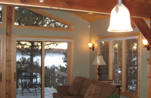 This beautiful, one bedroom plus, cabin suite on the water has everything a couple could want in a newly built comfortable getaway. This charming home has a wood burning fireplace, built in sound system, flat screen TV, granite counter tops and Old Hickory Club furniture. It is air conditioned and has in floor heat for year around comfort. It also is designed with additional in wall sleeping (Murphy bed) accommodations for the occasional guest. The great room with 12 foot tall ceilings is enhanced by professionally decorated interiors with a bold use of timber posts, beams, color and antlers.