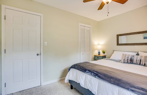 This cozy cottage is only a short 2 minute walk to our beautiful private community lake. The lake features plenty of picnic tables and BBQ grills. It also has a kids playground, covered pavilion, and restrooms, all down by the lake. Did I mention it also has a small sandy beach? Yaay! The cottage is ready for your enjoyment with huge front deck, fire pit, and horseshoe pits. There's also a fenced in back yard for your pets.