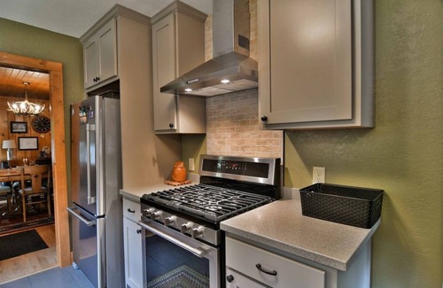 The quaint rustic interior features tongue-and-groove wood walls and ceilings, an antlered chandelier, and a gas stove/fireplace in the dining room and living room. There is a large screen, flat panel Smart TV so you can stream your own accounts, WiFi, and board games for your enjoyment. Full bath and bedroom with queen bed and ceiling fan round out this comfortable cabin rental.