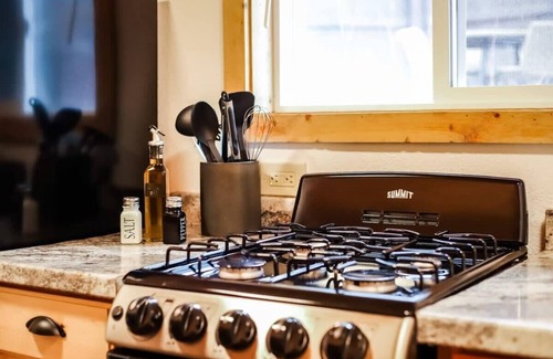Walk from the main area to the kitchen where you will find a refrigerator, gas stove/oven, toaster, microwave, coffee and all the cookware and dishes you need! Enjoy a small dining table set for two in the main living area. If you prefer to grill you can walk out the back door to your own private fenced in patio to enjoy some grilling and fresh mountain air! You will see the hummingbirds are everywhere up here and on a clear night the view of the night sky is spectacular! Fall asleep at night to the sound of the river!