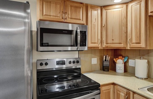 The kitchen is fully stocked with utensils, cooking and baking ware, small appliances and an array of spices and condiments for guests who want to cook their own meals. A gas barbecue grill and patio dining set are located on the deck just outside the kitchen.