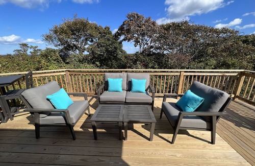 Experience the best of peaceful outdoor living on Martha's Vineyard at Island's End!!! Great water views from every room and the wrap around deck. Enjoy morning coffee on the deck overlooking the Atlantic Ocean and Nomans Land and listening to the waves reach the beach. After breakfast, it's a 10-15 minute walk to Moshup Beach where you can spend the day on the beach or reading a book under the spectacular Aquinnah Cliffs. Or stroll to the Aquinnah Shops for coffee, snacks, or gifts for those you want to make jealous of your vacation. In the afternoon, you can relax on the East side deck with views of Chilmark and Menemsha Hills or from the North back deck you can enjoy a vista of conservation land to the Vineyard Sound and the Elizabeth Islands in the distance. And of course no trip to Aquinnah would be complete without visiting the Gay Head lighthouse. Finally, there is no better place on Martha's Vineyard than the Aquinnah Cliffs observation deck to watch the sunset. To top things off, one of the best restaurants on island, the Outermost Inn is a 5 minute walk away.