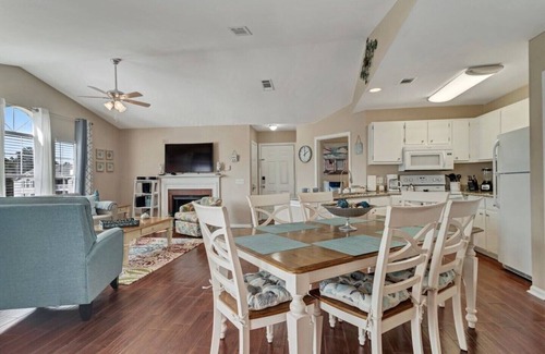 Enjoy granite countertops, fresh paint, and coastal cottage style furnishings in this inviting home. The open living area boasts a flat screen TV, a comfortable living room, and a fully equipped kitchen with a dining table set for 6. Additional seating for three at the kitchen counter.