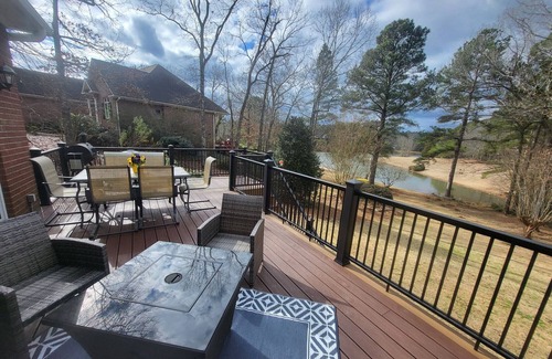This charming, made-for-entertaining home sits on a large .84 lot, boasting beautiful backyard views/access to Royal Lake, located in Aiken’s premier gated golf community, Woodside Plantation. There are four bedrooms and three full bathrooms to provide you and your family with a comfortable place to unwind during your stay. The open floor plan offers plenty of mingling and hosting space with a formal living room, family room, spacious sunroom, and huge back deck with water views. Additional table space, seating, a gas & charcoal grill, and fire pit are available on the deck for your enjoyment. Feed the geese, fish from the bank, or feel free to take the jon boat out on the lake. Golf and dining packages are available at Woodside Country Club, just 1/2 mile from this rental. The master bedroom has deck access and an attached bathroom with a jetted tub, walk-in shower, and two vanities. There are two additional full bathrooms (one on the main floor and one downstairs.) Wi-Fi and several streaming services are available, along with a dedicated office space. Make this your home away from home during the greatest week of golf!