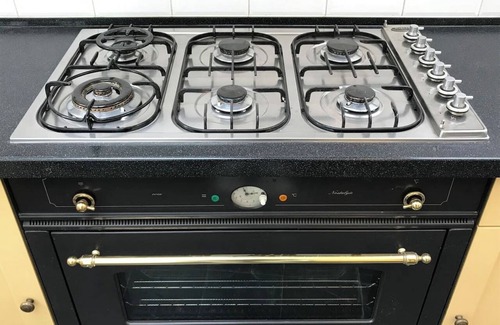 Spacious kitchen (14 m2) also in an authentic atmosphere with lots of light and a door to the outside terrace. The kitchen has a large 6 burner Boretti stove, large sink, ovens, microwave, fridge, mega freezer with water cooler and ice crusher, large dishwasher and plenty of cupboard and counter space.