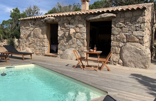 Traditional Corsican house inspired by ancient sheepfolds in stone and wood. Modern comfort and heated swimming pool in the heart of the maquis. Calm, mountain view.