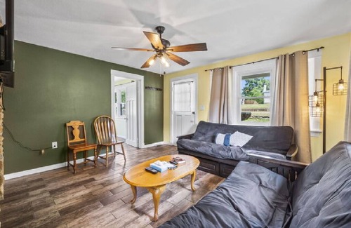 This one-bedroom bungalow has a private bedroom with a King Size bed and living room with two full size futons. The kitchen is equipped with a full-size fridge, stove/oven and microwave. The bathroom has a spa shower/tub. The bungalow also has a large front porch with seating area. Located close to many great state parks such as Elephant Rocks (5 miles), Johnson's Shut In's Taum Sauk Mountain state park (highest point in Missouri) and Shepard Mountain Bike Park. Also enjoy the Arcadia Academy within walking distance to which you will find a restaurant called Thee Abbey Kitchen, a bakery, homemade Ice Cream Shoppe, candies/gifts and much more to explore!