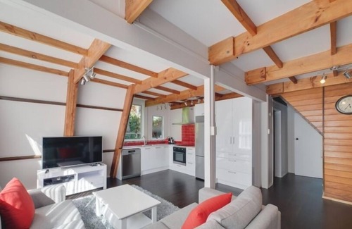 The lower living area is all open plan with a kitchen, living and dining in the same room. The property has 2 decent sized bedrooms with both with queen beds and the 3rd bedroom is a little smaller with 2 singles. The place is fitted with laminate flooring in the main areas and all bedrooms have carpet. This is a small house with character!