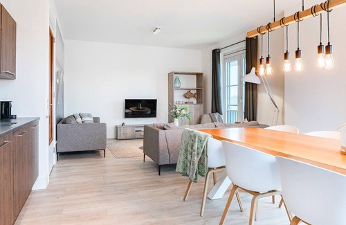 This modern and luxurious holiday apartment in an elegant apartment building offers you the perfect place to unwind. The stylish furnishings and bright, maritime ambience create a calm and inviting atmosphere. Here you have plenty of space to feel at home with your family or friends. Come together in the open-plan living room, which successfully combines the kitchen, dining and living areas and invites you to cook, eat or relax together.