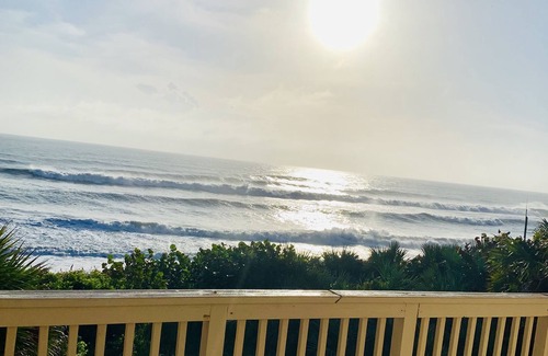 A Picturesque Ocean Front 2-Story warm cozy and charming "beach house" right on the beach for beach fun sunning, sand castles, and long walks just steps away from the ocean, a pool of fun swimming, tubing, floating, kayaking, paddle boarding, surfing, fishing, snorkeling and more. Once described by a guest to be an "eccentric and funky" place is more aptly described as an imaginatively fun and artsy "beach house" with tastefully selected art, sculptures and figures. On a Private Beach makes for a fun family vacation located in the quaint Town of Melbourne Beach, Florida. It is paradise ripe fun filled get-a-away for a relaxing quiet stay or, one packed with surfing, paddle boarding, kayaking, surf fishing, swimming, snorkeling. kite flying, kite surfing, wind surfing, and tubing for the ocean frolics to be combined with all the beach-sun fun. From the top deck one can Catch and capture the Cape Canaveral rocket launches. These rocket launches are readily seen from the patio deck with or without the telescope. The "beach house" is convenient to plenty of golf, boating, bicycling, jogging, restaurants, major shopping including that of down-town Melbourne. It has 3 bedrooms with king-size beds and 3 1/2 baths with elevator for handicap guests and an outdoor shower for rinsing from the day at the beach. The beach house is located on nearly acre, its an private ocean front estate with pet friendly escapes to a fenced yard for their personal business. Oh, you must experience for yourself. a bottle of champagne awaits you. Making your most enjoyable your host,