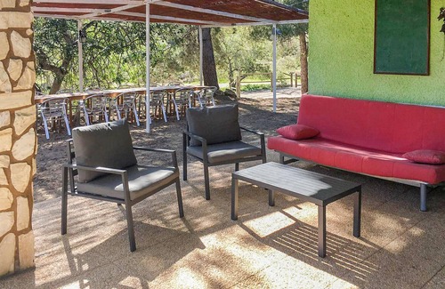 This house is the perfect choice for several families or groups on a 10.000m2 plot. The six en suite bedrooms are arranged side by side. The fifth bedroom has bunk beds and a whirlpool tub and the sixth offers a shower with massage jets. In the outbuilding you will find a fully equipped commercial kitchen with two dining rooms and two toilets. All rooms have air conditioning and television. Catering, massages, yoga and reiki classes can be provided upon request. The quiet place offers a lot of privacy.