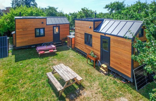 Treat yourself as a couple or small family to a soothing break in this cozy vacation home. You will find everything you need to relax and feel at home in a small and well-designed space. The wood paneling inside creates a homely atmosphere. Enjoy your meals outside at the picnic table and get into conversation with the guests of the neighboring house or travel with a family friend or couple.