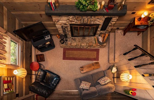 The Azalea Cabin features a loft bedroom with a King size bed. Amenities include a fireplace, full kitchen with mini refrigerator and Keurig coffee maker, living room, spacious bathroom, flatscreen televisions with cable channels and complimentary Wi-Fi. Enjoy our outdoor living room and landscaped garden scattered with cozy seating. Azalea Garden Inn is located on Main Street in Downtown Blowing Rock. In addition to being walking distance from shops and restaurants, the property is a short drive from outdoor activities, hiking trails, attractions, ski slopes, Boone, and Appalachian State University.