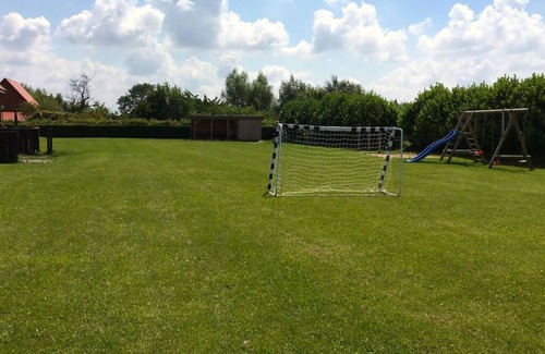 Family -friendly, comfortably equipped apartment on the ground floor with a terrace and direct access to the garden (800m to the beach). 2 bedroom, large open living/dining area (sofa bed) with 55 "flat-screen TV, Playstation 3 console with various games, music system, DVD player with films, as well as a Disney plus subscription, also for the small guests and a well-equipped integrated comfort kitchen . Oven, dishwasher, cooling/freezer combination, Senseo coffee pad machine and coffee machine, microwave, etc. The 63m² apartment is located in one of two pretty houses with other residential units connected by the indoor pool with counter -current system (5m x 8m). Large lawn, play and football field. Grill area with seating in the facility.