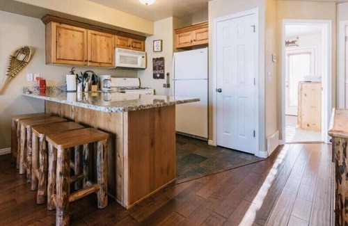 Our condo is a haven of comfort, designed to host up to four guests easily. Each bedroom is a refuge of relaxation, adorned with clean, high-quality linens, pillows, and towels. The living space, illuminated by natural light and mountain views, features a large TV and cozy seating in an inviting open layout. Families will enjoy a fully equipped kitchen with all necessary appliances and utensils, a gas stove, spacious countertops, a fridge w/ freezer, a microwave oven, and all the essentials.