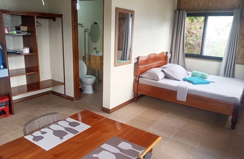 The beach is right outside your front door. Snorkel the reefs or lounge on your spacious roof deck above to enjoy views of the islands and sunsets over the water. We offer island hopping, scuba diving, kayaks, and snorkeling gear. Fast Starlink satellite wifi, queen bed, ensuite, kitchenette, dining table, and ceiling fans. Extra foam mattress available to make a second bed. Meals available or cook your own. Only 30 minutes from Coron in our speedboats.