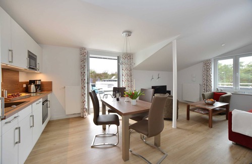 The beach chair apartment has a double bed in the bedroom and a sofa bed in the living area. A cot / crib can be placed. You can use the in-house sauna with a spacious relaxation area free of charge after registration. There is a washing machine, dryer and bicycle storage room in the house. Equipment of the apartment: roof terrace with garden furniture and beach chair elevator bath with shower kitchen with dishwasher, oven, microwave, filter coffee machine radio, 2 flat screen TV's, Blu-ray player parking lot, bicycle storage room sauna in the house coin operated washer / dryer in the house WiFi