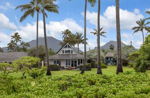 Island living at its finest, "Kailua Kai" is a beautiful, yet casual beachfront home located on the Windward side of Oahu, 30 minutes from Honolulu and approximately 1 mile from the center of Kailua Town. Enjoy spectacular sunrises over Kailua Bay, the scenic Ko'olau Mountain Range and outlying islands right from the front lanai. The home enjoys cool breezes that come off the ocean, a large open floor plan, spacious guest rooms and an expansive ocean front, manicured lawn with swaying palm trees and the ocean beyond. Guests can enjoy swimming, body surfing, paddling and fishing right from the backyard! The kitchen is fully equipped with everything needed for a culinary feast, or Kailua Town is just a 5 minute drive with its' myriad of restaurants to choose from.