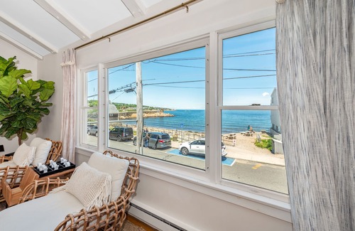 Expansive Atlantic views, and steps to Front Beach, design enthusiasts and beach lovers alike will delight in this renovated 5 bedroom Rockport village retreat. A short stroll to the extraordinary Shalin Liu Performance Center and just steps to Bearskin Neck's galleries, restaurants and shops, this property is perfectly located for those seeking relaxing beach time, nature walks, cultural experiences and all Cape Ann has to offer. The home offers three floors of living, including bedrooms on each floor, making it well-suited for groups traveling together. The main floor offers extraordinary water views from the dramatic, cathedral ceilinged living room, complete with cozy fireplace and casual dining/game alcove. Large space, perfect for big groups. Sip your morning coffee and watch lobstermen at work and sailboats cruising by. The kitchen is located off of the main living area and features a stylish beaded chandelier, robin's egg blue cabinets & statuary quartz counters with island and dining table. Direct access to the back deck for easy summer entertaining. Private beachy bedroom and bath with shower complete main floor. Upstairs, 3 bedrooms, all with vaulted ceilings, and funky yet sophisticated decor. A full bathroom w/Italian Encaustic tile, striking green vanity and beautiful white-washed modern beach wainscoting. The first floor has an oversized bedroom with views of the water . A large tv and couch make it a great space for a movie! Walk out the door, take 10 steps and you are in the sand!