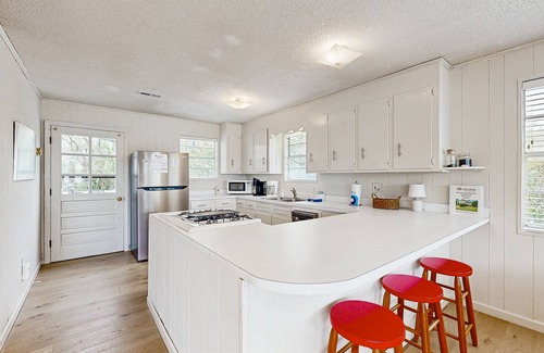This roomy beach home is the perfect spot for your next destination getaway. With an open deck for soaking up sun and star gazing, you can indulge in witnessing all of the nature surrounding you while sipping your morning coffee or evening cocktails. For rainy or too-hot days, the covered patio under the house provides the perfect location to relax and gather for respite. Inside, the home offers plenty of space and seating for various activities, and the fully-equipped kitchen has everything you need for whipping up all your favorite meals and snacks. For a little privacy, or winding down at the end of a busy day, sink into comfortable beds and enjoy the TV and ceiling fans provided in the bedrooms. Grill out on the deck or swing lazily on the tree swing; there's no shortage of fun. Only blocks away from the beach, your days will be fun-filled in the surf and sand. There are also so many other things to do, from touring the environmental center with interactive displays and live-animal exhibits to hiking or walking and shelling (there are even wheelchair-accessible trails), to fishing along the pier, or launching a boat into the Big Bat Creek. Of course, take advantage of all the local shops, boutiques, and eateries.
