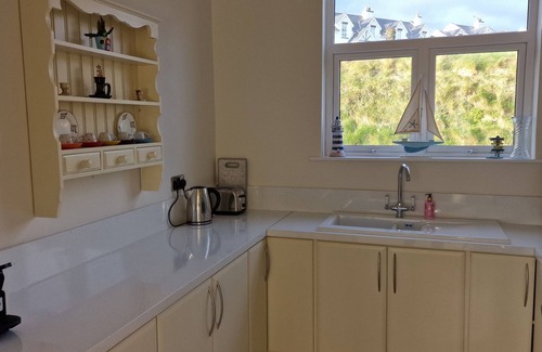Amenities: Oil central heating. Oven, hob, microwave, Air Fryer, fridge/freezer, washing machine, tumble dryer, dishwasher. TV, WiFi. Fuel and power inc. in rent. Bed linen and towels inc. in rent. Parking available. Decked terrace with furniture. One well-behaved pet welcome. Sorry, no smoking. Shop 2.3 miles, pub and beach 0.1 miles. Note: There are five steps down to the open-plan living space