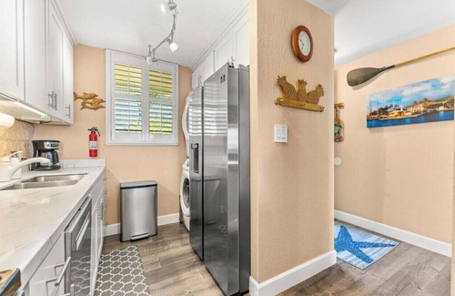 beautiful, updated 2 bedroom, 2 bathroom vacation rental with a tropical feel can sleep 4-6 people. The master bedroom has an en-suite bathroom. This 4th floor unit features wood flooring throughout, island-style furniture, and a stunning kitchen with quartz countertops and stainless appliances. The kitchen is well equipped for cooking. Stay in and enjoy dinner while watching the sunset, or dine out at nearby restaurants within walking distance.