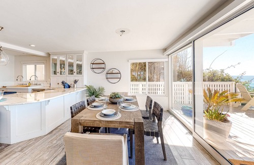 Step through the front door of this pristine, beachfront getaway and feel your tension and worries slip away as you are welcomed by spectacular views of the Pacific Ocean! This is coastal living at it's finest! Perched on a cliff overlooking the water, spend relaxing days out on your spacious, furnished deck with friends and family. Inside, the decor and deluxe furnishings create a wonderful light and airy feel that perfectly accentuates the infinite views beyond. The open, well-equipped kitchen has plentiful counter space and convenient seating for three. Choose to eat inside at your dining room table for six, or enjoy an al fresco experience out on the deck. After dinner, gather around the outdoor firepit and witness the sensational colors of a Southern California sunset, or relax indoors in the glow of the gas fireplace while you stream your favorite channels on the 65' flatscreen TV. Upstairs, the primary bedroom is nothing short of stunning, boasting large windows, a sunlit seating area, a private balcony with a hammock, and an exquisite en suite bathroom. Additional amenities here include a home office with a desk and chair and three monitors for remote work or schooling, a gas grill, washer/dryer, and complimentary internet access.