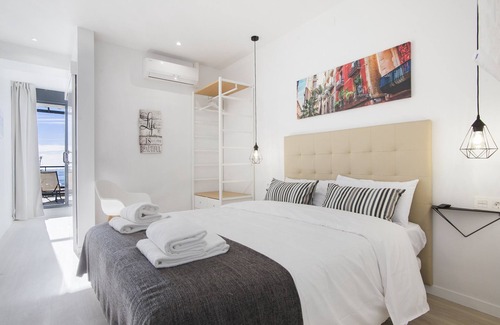 Penthouse apartment sleeping 2 guests, with a large terrace and spectacular views of the sea, sun beds and dining table, equipped kitchen, and bedroom with open wardrobe.