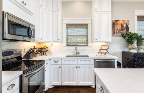 Brew yourself a cup of joe at the coffee/wine bar equipped with a Keurig machine. A chef's dream, the kitchen boasts white quartz countertops, beadboard cabinets, and stainless steel appliances, including a French-door fridge. The center island offers extra prep space and seating. This home is equipped with all the cooking utensils you need to whip up a fresh gourmet meal for family and friends.