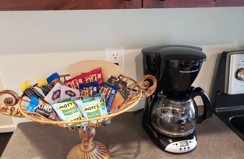 Our kitchen is fully equipped with anything you should need, including drip coffee pot, instant hot water pot, toaster, ice maker, and basic items to get you started like salt and pepper, cooking oil, and a few coffee filters. The drinking water from our well is excellent, and tested twice a year. The outdoor patio is where you may find yourself dining and cooking most often using the provided bbq.
