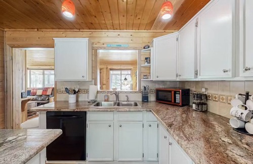 Inside, the full kitchen has everything you need to whip up home-cooked meals, while high-speed WiFi and smart TVs keep everyone entertained. A wood-burning stove adds that extra mountain charm. Traveling with kids? You’ll find a high chair and Pack ’n Play ready to go.