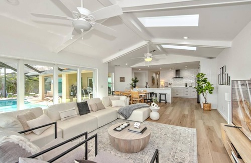 This completely renovated waterfront home is on the Caloosahatchee River in Cape Coral's prestigious Gold Coast area. It features 4 bedrooms each with smart TVs and has 3 full baths. The new kitchen is a Chef's dream. Sit in the Hotspring spa or go for a swim in the oversized heated pool. For entertainment, this house has it all. The House Interior and exterior: Fully furnished, 3 zone A/C system, heated pool, Hot Springs spa, pool, BBQ grill, billiards room, fitness room, big screen TV, whole-house SONOS music system, (Wi-Fi) wireless High-speed internet, Cable TV in all bedrooms, captains walk. Cruise to Sanibel and Captiva Island, or watch the dolphins and manatees on the Caloosahatchee River. If you’re a golfer, you can play any of our area's more than 50 golf courses. Restaurants and shopping are just minutes away. The beaches are just 25 minutes by car/boat. Amenities: Boating, fishing, golfing, tennis, biking, shopping, swimming, walking the beach, enjoying sunsets, and relaxing. As for fine dining, we have over 1500 restaurants in the area. For the kids, there is Sun Splash water park, a go-kart track, mini-golf, horseback riding on the edge of the Everglades, and much more. Bush Gardens in Tampa is just 2 hours by car, and Disney World Orlando is 3 to 4 hours by car. Additional charge for 5 people and up (please see rates and availability). If you are a bigger party, there is an opportunity to rent 5 vacation houses in a row. A boat lift is currently NOT available.