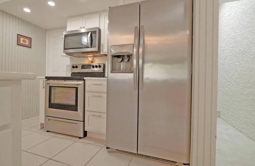 This beautifully renovated Reef condominium features a thoughtfully designed first-floor room addition, complete with an ensuite shower and built-in solar shade. The modern kitchen is a chef's delight, featuring all-new cabinets, sleek quartz countertops, new appliances, and a spacious island that’s perfect for entertaining. The main bathroom has been updated with a new vanity, while hurricane impact windows and an electric awning enhance the comfort and security of this lovely home.