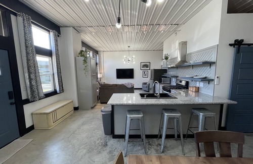 This two-bedroom apartment accommodates six. Come stay in this stylish and comfortable ground-level apartment close to downtown, the park, the hospital and many other restaurants and shops. Featuring high ceilings, custom lighting, a full service kitchen and dining while close to many activities around Mountain Home. Enjoy full amenities at a custom, creative redesign of a former carwash. Meander the park or relax on the patio out the back door.