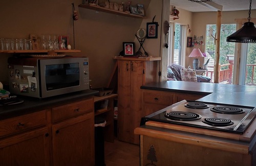 There's a spacious living/kitchen area on the main level, with a wood burning stove to keep you warm in cool nights. Bathroom is also on main level.