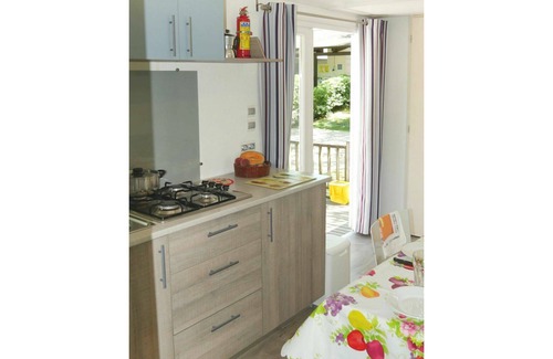 The mobile home offers various amenities to ensure a comfortable vacation experience. It has a shower and toilet facility, as well as air conditioning (with an extra charge). Outdoor areas include a partially roofed terrace with furniture, an electric portable barbecue, and two deck chairs. Additionally, mosquito nets are provided for your convenience. One reserved parking space is available for your vehicle.