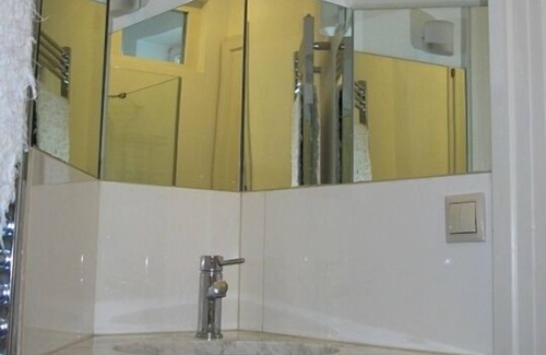The bathroom has a shower, heated towel rail, toilet and marble-topped sink.