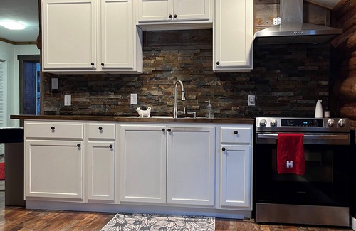 The living space offers a beautiful rock fireplace with a propane insert, large 60” TV, two leather recliners, leather sofa along with a cozy two chair ottoman area. We offer Wi-Fi, Hulu, Netflix, Apple TV.