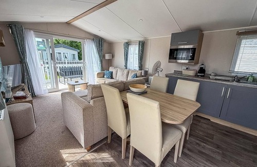 Beautiful caravan with large outside decking area. With a modern design and furnished to high standard