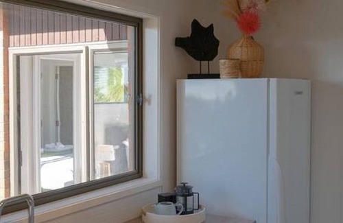 The house has two bedrooms and sleeps a maximum of 4 guests. Bedroom one features a Queen bed, and bedroom two has a Single bed with the option of an additional trundler bed.