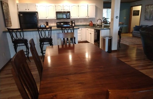 Hickory floors, kitchen set up to entertain with 7 barstools all around breakfast bars! Dining table seats 8-10 more with built-in leaf.