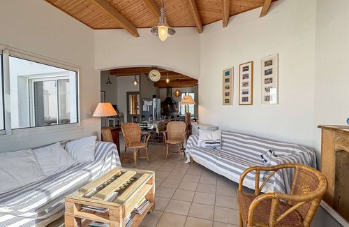 Beautiful modern and spacious single-storey house. It can accommodate 10 people. You will appreciate its large living room with its fitted and equipped kitchen. Night side, 5 bedrooms, 3 bathrooms, 2 WCs. You will have a HEATED swimming pool, protected by a roller shutter open from 05/15 to 09/30 (4m x 6m x 2m). Outside garden furniture, deckchairs, parasol, plancha, bicycle rack. PARKING - WIFI. COMPULSORY END OF STAY CLEANING AND LINEN (Bed linen, towel, bath mat, tea towels)