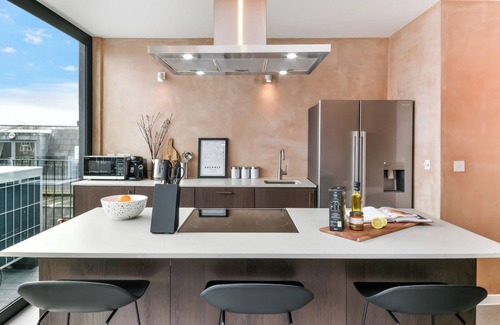 Head upstairs, and you’ll find five fantastic bedrooms(three of them an suite), all of which have storage. There’s a sparkling clean bathroom with a powerful, hot shower and free toiletries. The open-plan living, kitchen and dining area is the star of the show: beautifully light, with elegant furnishings, large plants and tasteful local artwork.