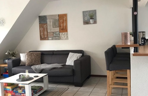 The apartment, about 50 m² is located in the attic with a bedroom with two single beds, which can be put together on request.